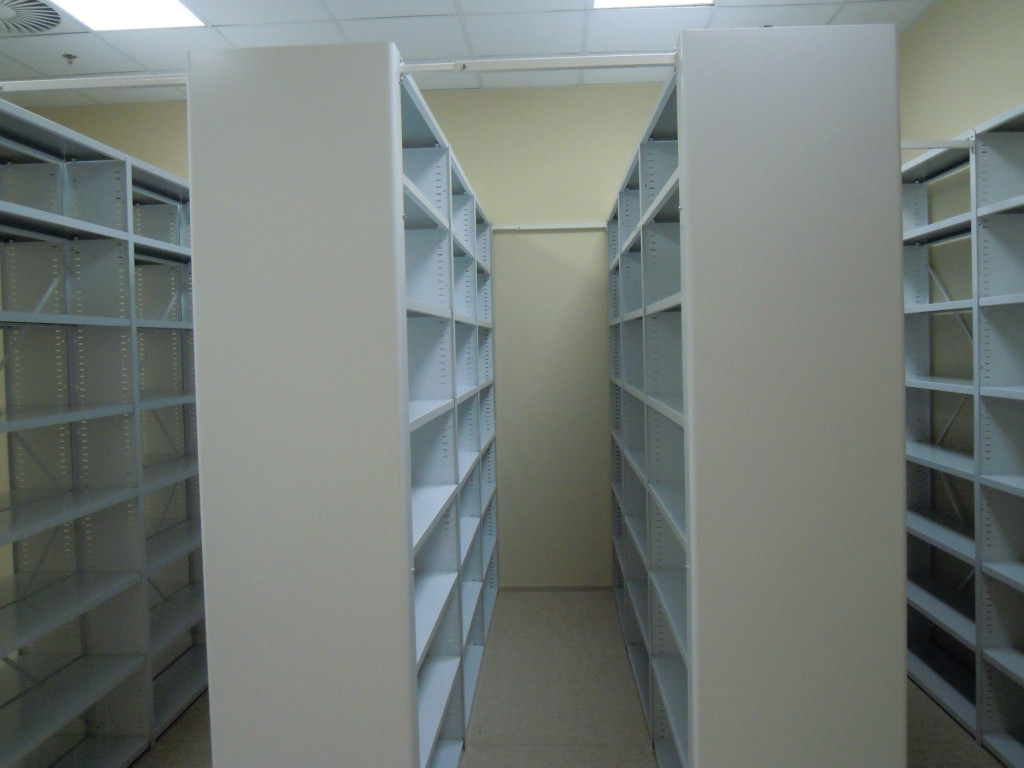 Системы компактного архивного хранения документов. Вдвое повышается вместимость или сокращаются занимаемые площади. Используются двухсторонние передвижные стеллажи для архивохранилища.